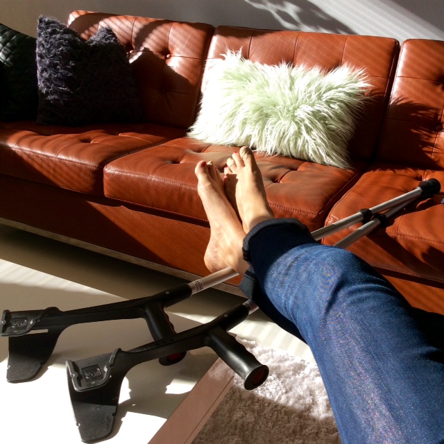 Yön yli seurasin jalan kuntoa ja sitten sunnuntaina piti jo hakeutua lääkärin, koska tarvitsin: kyynärsauvat, särkylääkettä ja sairasloman. Vasempaan jalkaan aloitettiin seuraavalla viikolla akuuttifysioterapia, joka sisälsi ultraääni ja sähköimpulssihoitoja sarjan. Hoidon jälkeen fysioterapeutti teippasi jalan kovalla joustamattomalla teipillä kipsimäiseen pakettiin. Nilkuttelin kaksi viikkoa sauvoilla ja kävin hoidossa useamman kerran. Lisäksi minulla oli Arcoxia kipulääkkeenä ja yölasta.