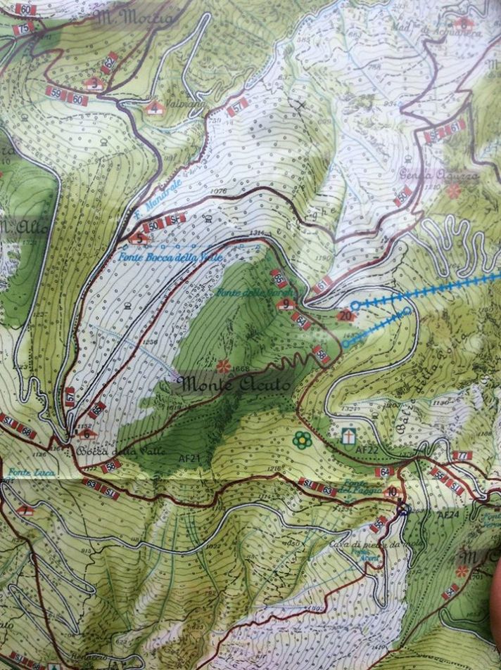 Kun pääsimme Monte Cuccon huipulle 1556m oli nousua matkalla 500m ja patikointimatka yhteensä noin 12 km. Huipulle pääseminen oli jyrkän kivikon takana, jonka minä etenin aika ”maanmyötäisesti” etten horjahda jyrkänteeltä. Ryömiessäni huomasin kivien välissä kiiloja, jotka oli hakattu turvaköyttä varten – turvaköysi olisi ollut kiva tässä kohtaa, varsinkin kun kallio oli märkä ja liukas. Eipä ole kuvia tuosta viimeisestä noususta ilman turvavälineitä, koska meni kaikki energia siihen että sain itseni henkisesti eteenpäin. Huippu oli jyrkänteen reunalla ja oikeastaan minua ei tuo sumu haitannut lainkaan. Oli vain hyvä etten nähnyt mikä pudotus alas olisi ollut jos askel olisi livennyt. Ylhäällä oli niin kylmää, että hiukseni olivat täynnä jäätyneitä kastehelmiä – ihan satumainen ilmiö.