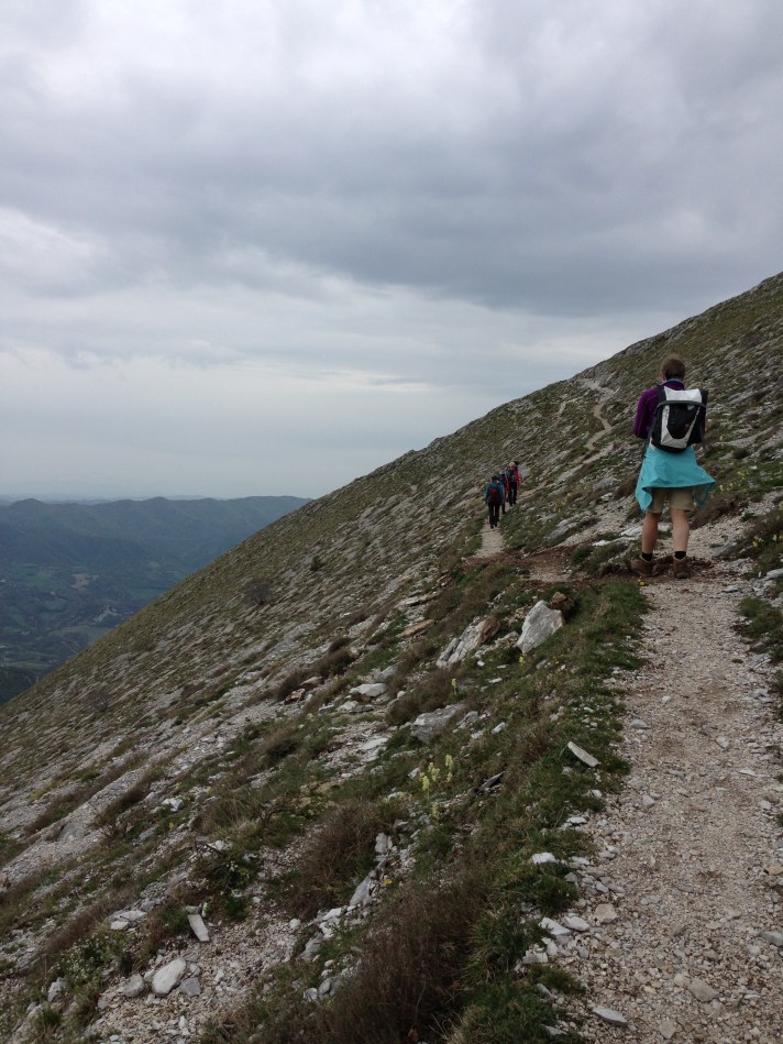 Reitti Monte Cuccon huipulle kulki kauniin luonnonsuojelualueen halki. Kevät oli jo pitkällä Italiassa. Alhaalla laaksossa oli lämmintä kuin Suomen kesässä, mutta ylempänä vuorilla on yllättävän kylmää ja kosteaa. Olinkin varautunut matkaan hieman liian vähissä vaatteissa. Varsinkin tauolla kevyttoppatakki fleecen lisäksi olisi ollut mukava.