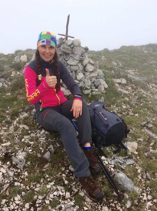 Kun pääsimme Monte Cuccon huipulle 1556m oli nousua matkalla 500m ja patikointimatka yhteensä noin 12 km. Huipulle pääseminen oli jyrkän kivikon takana, jonka minä etenin aika ”maanmyötäisesti” etten horjahda jyrkänteeltä. Ryömiessäni huomasin kivien välissä kiiloja, jotka oli hakattu turvaköyttä varten – turvaköysi olisi ollut kiva tässä kohtaa, varsinkin kun kallio oli märkä ja liukas. Eipä ole kuvia tuosta viimeisestä noususta ilman turvavälineitä, koska meni kaikki energia siihen että sain itseni henkisesti eteenpäin. Huippu oli jyrkänteen reunalla ja oikeastaan minua ei tuo sumu haitannut lainkaan. Oli vain hyvä etten nähnyt mikä pudotus alas olisi ollut jos askel olisi livennyt. Ylhäällä oli niin kylmää, että hiukseni olivat täynnä jäätyneitä kastehelmiä – ihan satumainen ilmiö.