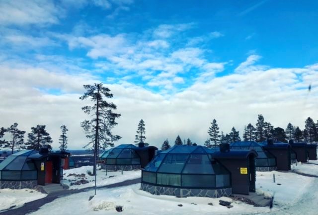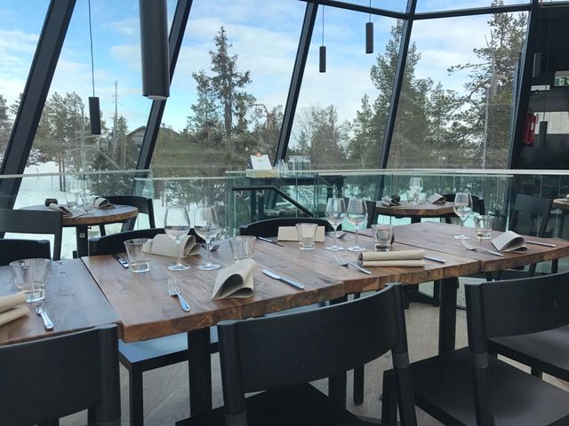 Ravintolan lasinen katto kohoaa korkeuksiin. Tällä kertaa saimme ihailla sinivalkoista taivasta. Aivan maagista olisi nähdä revontulet tai kirkas tähtitaivas illallisella.