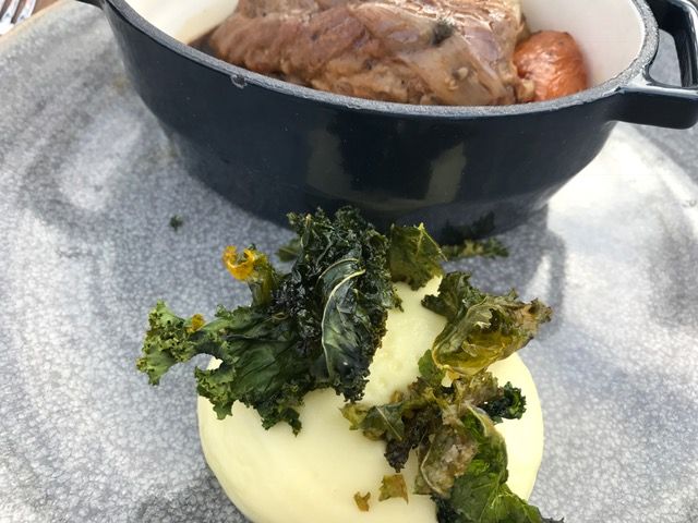 Pääruuaksi oli kypsäksi haudutettua karitsaa padassa, jossa oli mukana juureksia ja sipulia. Lisäkkeenä puikulapyree ja rapeita lehtikaalisipsejä. Erittäin herkullista ja annos oli myös sopivan kokoinen. Ruokajuomana oli karitsalle Torres Mas Rabell Tinto, Catalunya, Spain.