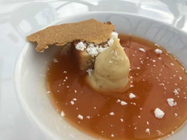 Jälkiruokana minulla oli hillakeittoa, financier-leivos ja vaniljakreemiä. Keitto oli aivan ihanan makuista. Oli hieman vaikeuksia olla kallistamatta lautasta (sehän ei kuulu hyviin pöytätapoihin), sillä olisin halunnut kaapia viimeisenkin pisaran keittoa lusikkaani.