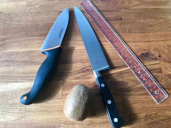 On todella tärkeää, että sinulla on hyvä veitsi millä työskentelet. Itse käytin Fiskarsin kalanfileeraussetin todella teräviä veitsiä. Lisäksi tarvitset jonkinlaisen mitan, jotta palaset ovat samankokoisia. Minä käytin viivotinta, jonka pesin astianpesuaineella ennen käyttöä.