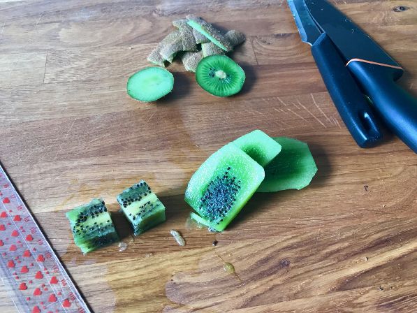 Kiivi hedelmä on hieman haasteellinen kuutioida. Isosta kiivistä saat 2 kpl näitä 2 cm x 2 cm kuutioita. Jos teet pienempiä kuutioita voit saada 3 kpl kuutioita. Kiwin keskusta on haasteellinen leikata terävälläkin veitsellä, sillä se on pehmeää ja hieman ”venyvää”. Kiivi kannattaa leikata paloihin tuon tasaisen vihreän hedelmälihan alueelta ja silloin palat ovat melko suuria ehkä 2,5 cm x 2,5 cm.