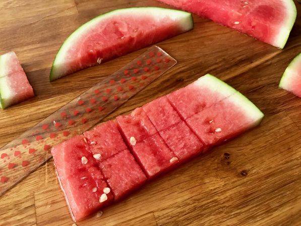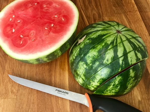 Vesimelonin kanssa vaihdoin vielä pidemmän veitsen jotta sain sen hyvin siivutettua. Ensin meloni puoliksi ja sen jälkeen puolikas 2 cm siivuiksi. Tavallinen vesimeloni on hieman vetistä höttöä tuosta keskeltä, joten parhaimmat palat saat sieltä kiinteämmistä osista melonia. Cantaloupenmeloni, verkkomeloni, Piel de sapo ja hunajameloni sopivat mielestäni paremmin kuutioimiseen kuin vesimeloni rakenteensa puolesta.