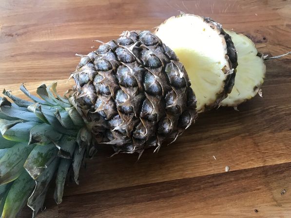 Leikkasin tuoreen ananaksen ensin 2 cm siivuihin. Sen jälkeen poistin ananaksen kuoren siivuista ja leikkasin sitten siivut neliöiksi. Neliön keskimmäinen pala kannattaa laittaa roskiin, sillä se on erittäin kova ja mauton. Ananas on erittäin helppo kuutioida ja siinä hyvä väri sekä maku eli suosittelen sen käyttöä tähän kuutioon.
