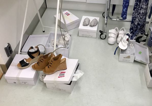 Meikkaustilan vieressä oli huone, jossa oli valmiina rekissä kuvauksissa käytettävät vaatteet ja asusteet. Kahden muun mallin kanssa kävimme vuorollamme stylistin kanssa sovittamassa meille varattuja vaatteita.