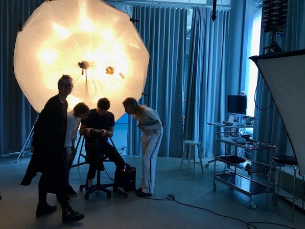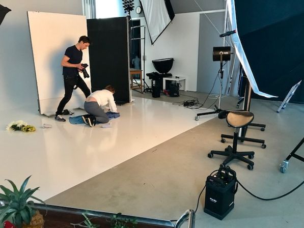 Kun vaatteet oli kuvattu päällä niin seuraavaksi ne kuvattiin lattialla valkoista taustaa vasten asusteiden kanssa. Ellos voi käyttää kuvia muissa yhteyksissä, joten oli tärkeää saada kaikki outfit kokonaisuudet kuvattua kahdella eri tavalla. No tässä kuvassa minä sitten salakuvasin kuvaajaa ja stylistiä.