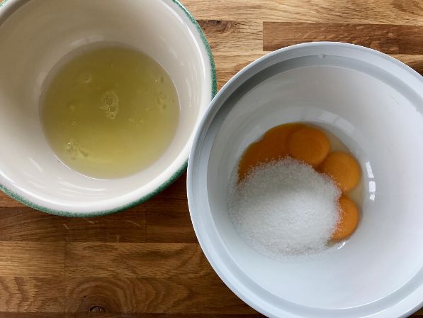 Erottele munan keltuaiset ja valkuaiset omiin kulhoihinsa. Keltuaiset vatkataan vaahdoksi sokerin kanssa. Valkuaiset vaahdotetaan kovaksi vaahdoksi ilman mitään lisukkeita.