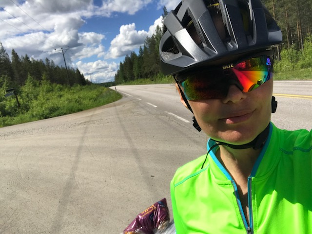 Tässä ajetaan legiä Valkeakoski – Helsinki 154km. Päällä on ihan tavallinen Kari Traan tekninenpaita. Paidan väri on kuitenkin sen verran kirkas, että se on turvallinen pyöräilijälle. Tästä kuvasta huomaa, kuinka uusi kypärä sopii hyvin ajolasien kanssa muodoltaan yhteen. Kasvot on aika hyvin suojattu itikoilta ja lentäviltä pikkukiviltä, kun otsakin peittyy lasien alle. Jalassa on ihan tavalliset Kari Traa pitkät juoksutrikoot. Näiden housujen alle olen laittanut pyöräilyalushousut joissa on pehmusteet. Joskus on kiva käyttää muitakin trikoita ja laittamalla alle pehmustetut alushousut, niin pylly kestää pidemmänkin lenkin kuten kuvassa on meneillään. Kenkien päällä on Shimanon kengänsuojukset, jotka pitävät tihkusadetta mutta kunnon sateella niiden alle kannattaa laittaa kahden litran pakastepussit. Kengän suojukset maksavat noin 60€ ja on kyllä kummallista etteivät ne pidä kunnon sadetta. Klossien kohdat olen vielä tiivistänyt kengän sisäpuolelta ilmastointiteipillä, mutta vesi tulee ilman muovipusseja läpi myös tuosta suojuksen päältä. Näillä kengänsuojuksilla voi ajaa klosseilla, koska niiden pohjassa on aukot kenkien kiinnittämistä varten.