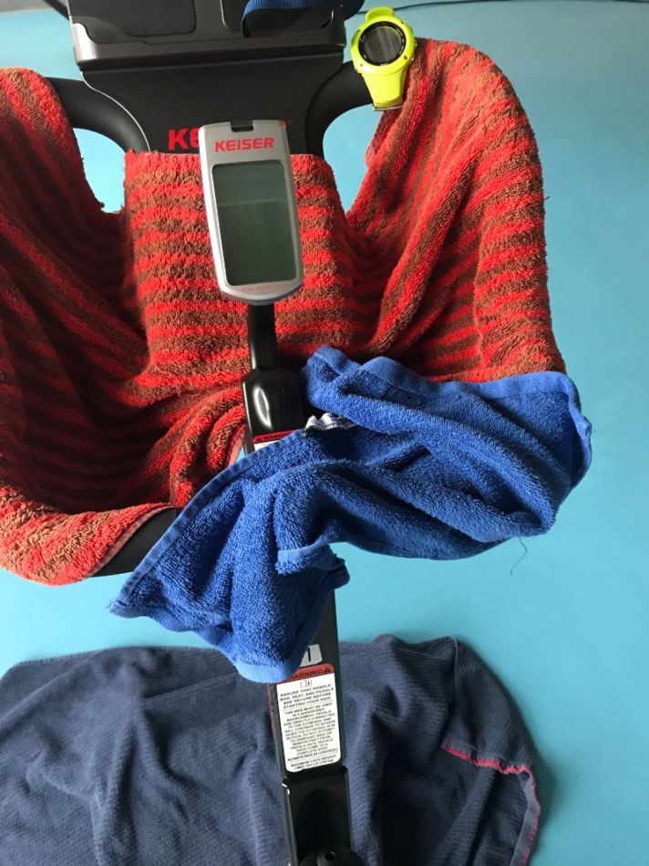 Kuvassa ylhäällä olen vuorannut spinning pyöräni kolmella pyyhkeellä. Yksi pyyhe lattialle, niin ei tarvitse pestä lattiaa hiestä tunnin jälkeen. Monella miehellä on tunnin jälkeen ”uima-allas” siinä lattialla omasta hiestä, joten kyllä minä siihen verrattuna olen sisäsiisti. Toinen pyyhe laitetaan ohjaustangolle, jotta hikiset kädet pysyvät paremmin paikoillaan. Kolmas pieni pyyhe ohjaustangolla on suurempien hikien pyyhkimiseen kasvoilta. Ei ole kivaa kun suolavesi valuu silmiin. Lisäksi itse laitan vielä Suunnon rannetietokoneen tuohon tankoon kiinni, niin näen millä sykkeillä mennään. Spinning on laji jossa seuraan sykkeitä tarkkaan. Jos harjoituksen on tarkoitus olla peruskestävyystasolla pitää noita sykkeitä vahtia, koska ne helposti nousevat liikaa suhteessa tunnin tavoitteeseen.