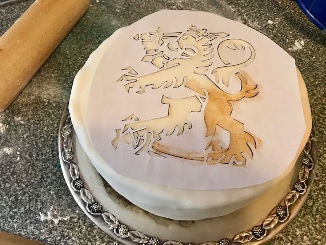 Minun vastuulla oli siis jälkiruoka. Kakun lisäksi oli tarjolla Suomi piparkakkuja, tuoretta lakritsia ja brunbergin tryffeleitä. Kakussa on suklaakakkupohja ja täytteeksi laitoin valkosuklaavanilija- ja vadelmamoussea. Kakun päällä on sokerimassakuorrute ja siihen tein sabluunan avulla elintarvikekullasta Suomenleijonan.