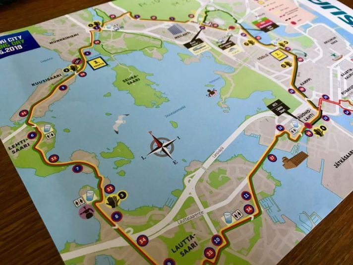 Tämä oli minulle kolmas HCR puolimaratoni. Reitti kulkee kivasti pitkin Helsingin kauniita rantoja, kuten kartasta näkyy. Jopa oli kuumaa ja ruuhkaista juostessa lähdöstä kohti Pikku-Huopalahden ensimmäistä huoltopistettä. Urheilujuomaa tuli kumottua heti lasillinen tällä pisteellä. Tosin kun yrittää juoda ja juosta samalla niin roiskuu juomaa pitkin kasvoja sekä vaatteita. Matka jatkui kohti Seurasaarta ja sieltä Kuusisaari – Lehtisaari – Lauttasaari. Ihmiset olivat kivasti tulleet piknikeille ja kannustamaan perheineen reitin varrelle.