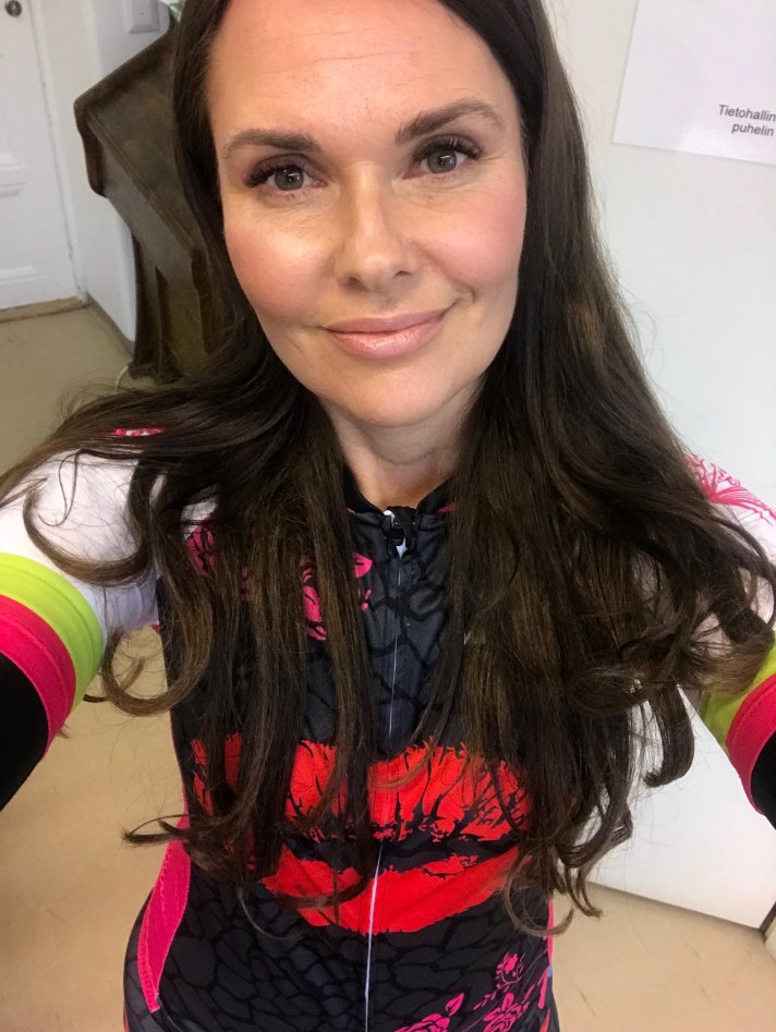 Tässä setti jossa on hauskoja punattuja huulia sekä paidassa että housuissa. Tämän setin housut ovat henkselimalliset ja ne pysyvät hyvin päällä, mutta toisaalta nuo henkselit ovat hieman epäkäytännölliset naisille. Pyöräilyhousujen tulee olla napakat päälle, sillä liian isoissa housuissa pehmentävä säämiskä voi hiertää ihoa. Tämä asu näkyy kokonaisuudessaan artikkelikuvassa, joka on Mikko Hannulan/ Sanoma Studio ottama Helsingin Keskuspuistossa.