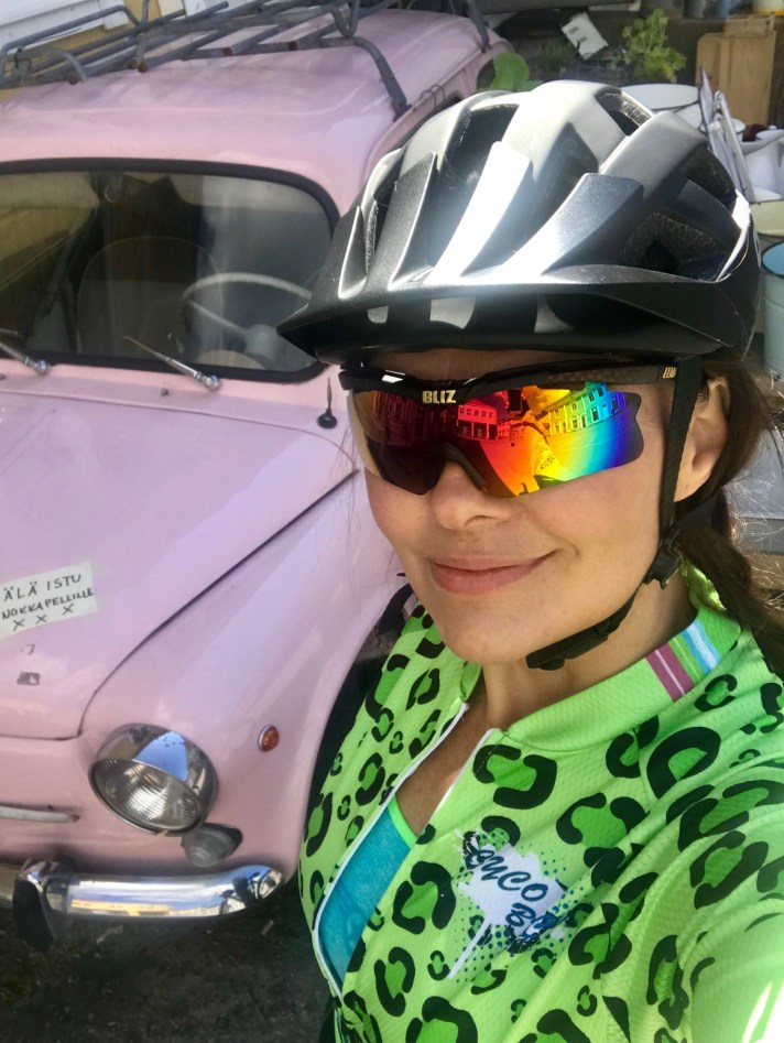 Tämä kuva on helatorstain Helsinki – Porvoo – Helsinki päiväretkeltä. Erään sisustuskaupan edestä löytyi tämä ihana pinkki auto. Tällä reissulla päällä vihreää ja paidan alla lämmikkeenä juosutoppi.