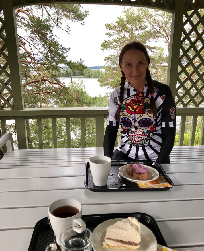 Tämä kuva on otettu Eteläiseltä – Pirkanmaalta Visavuoresta. Suosittelen käymään tässä kauniissa kulttuurikeskuksessa, jonka kahvilassa on kaikki herkut itseleivottuja. Tänne kauniin luonnon keskelle sopiikin hyvin minun ”pääkallopaita”. Tämä kyllä huomataan tiellä ja autoilijat kiertävät kaukaa. Tämän paidan kanssa myös käytössä nuo mustat irtohihat.