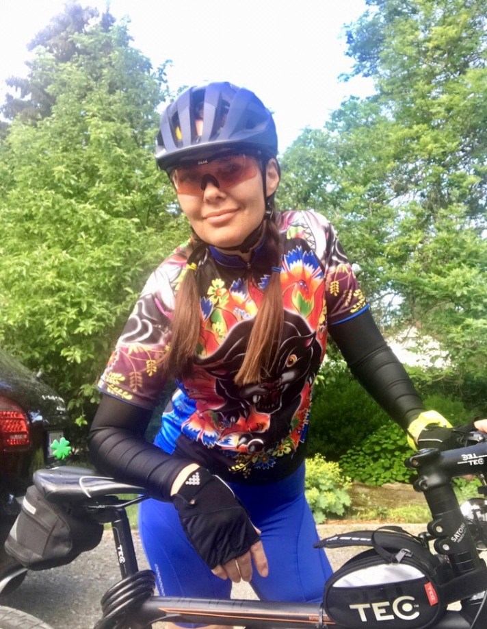 Sitten kesän iloksi on hankittu myös tällainen ”peto”-paita. Pyöräilypaidan tulee olla kapea ja istuvaa mallia. Liian iso paita lepattaa tuulessa ja se on ärsyttävää. Pussimainen paita myös hidastaa menoa ja pitää jopa ääntä. Hihansuissa on yleensä pieni silikoninauha, joka pitää hihan paikoillaan. Tämä paita on lyhythihainen, mutta käytän lisänä usein irtohihoja. Irtohihat ovat käytännölliset monellakin tapaa. Jos aamusta on kylmää voi laittaa irtohihat lämmittämään käsivarsia. Ajon aikana hihat on helppo rullata ranteisiin tai ottaa kokonaan pois. Irtohihat ovat kätevät myös aurinkoisena päivänä jos haluaa suojata ihoa palamiselta tehokkaammin kuin aurinkorasvan avulla.